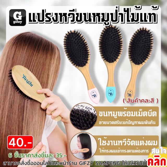 Bright wooden comb brush แปรงหวีขนหมูป่าไม้แท้ ราคาส่ง 35 บาท Gifzysampeng
